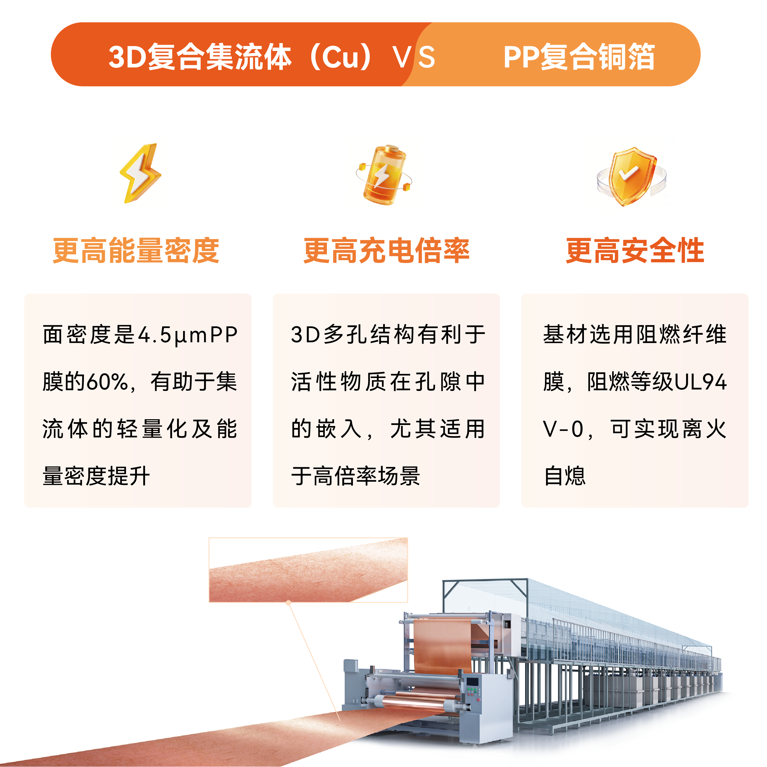 打破传统复合铜箔“金属-高分子-金属”的三明治结构,尊龙凯时人生就是搏首创3D复合集流体(Cu)工艺,采用三维多孔结构设计,在延续传统PP复合铜箔优势基础上,其铜箔面密度仅为4.5μmPP复合铜箔的60%,并且实现了更高能量密度/充电倍率/安全性等关键性能的多维突破。